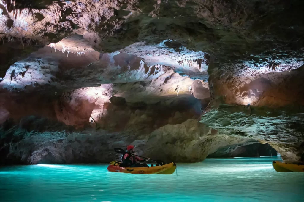 A diferencia de la visita tradicional en barco, la visita en kayak es una visita más pausada que dura aproximadamente 2 horas. Siempre acompañados por guías profesionales, los grupos son reducidos (unas 16 personas) y se exploran todas las galerías del tramo visitable formado por el río subterráneo navegable más largo de Europa.